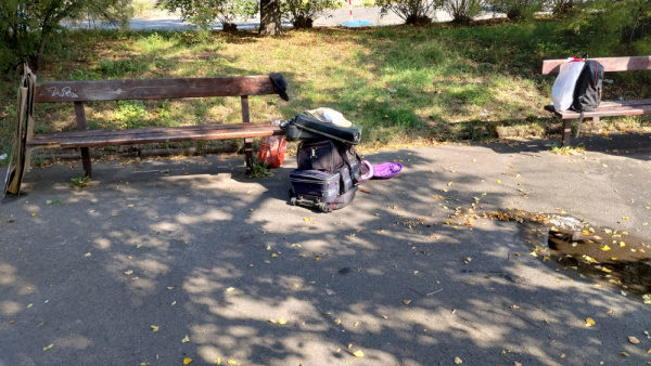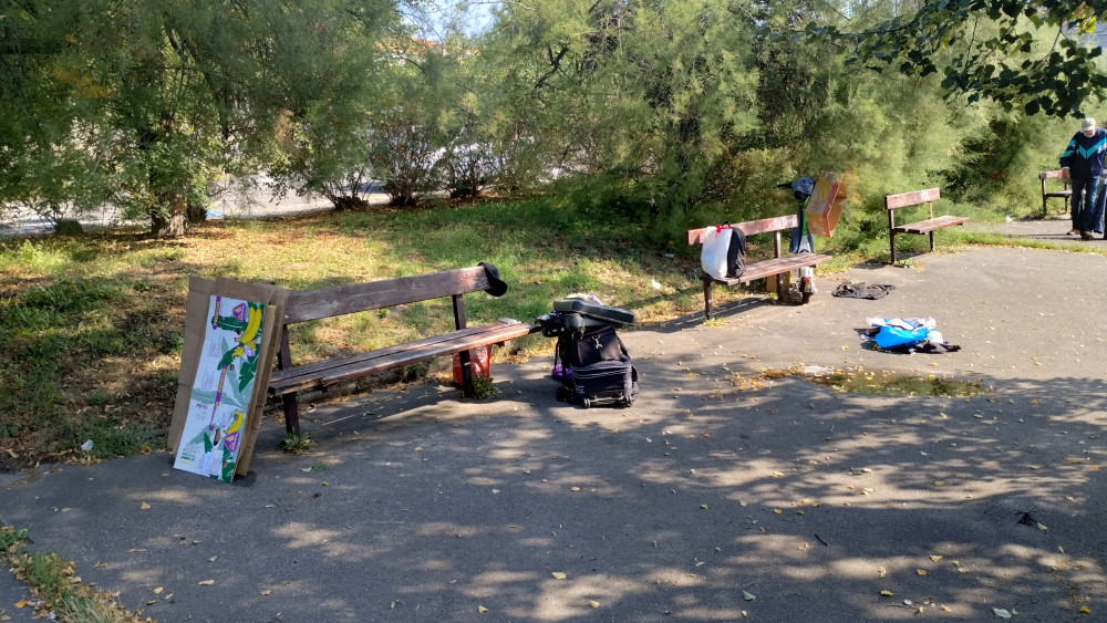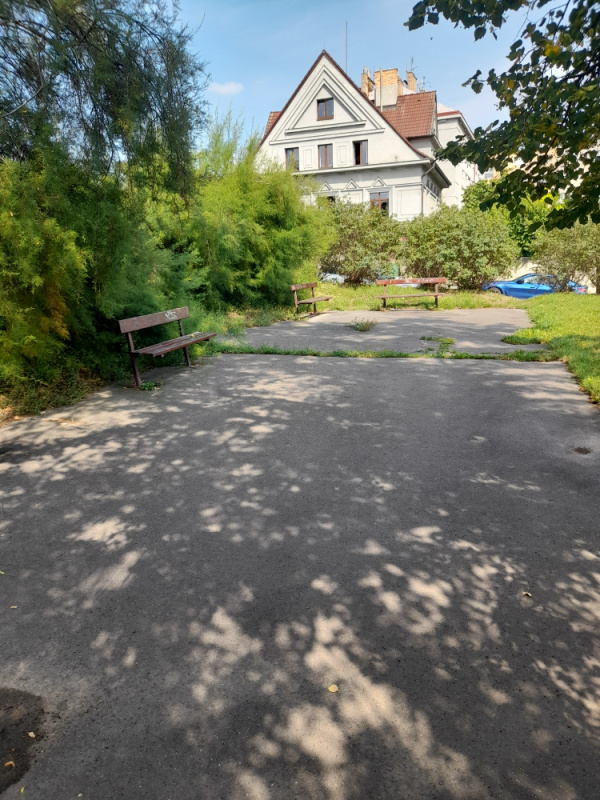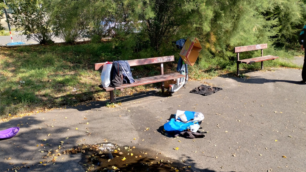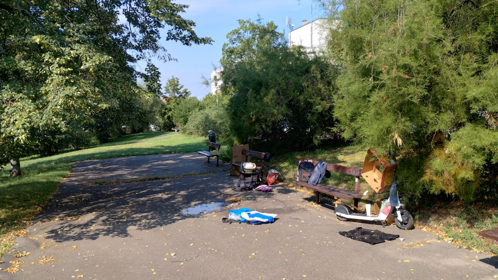 Park v ulici Nad Ohradou, naproti sloupu veřejného osvětlení č. 302233 nepořádek zřejmě po bezdomovcích