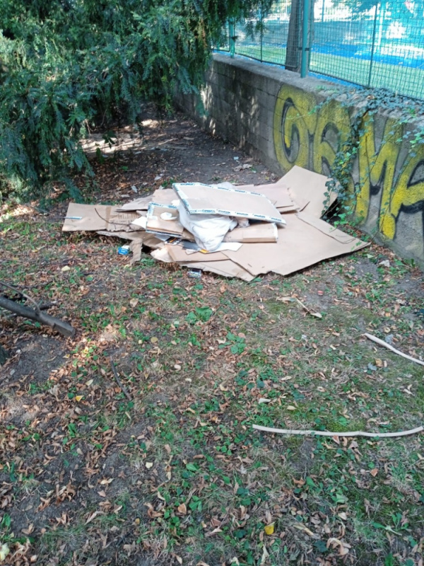 krabice po bezdomovcich vedle tenisu na Olsanske