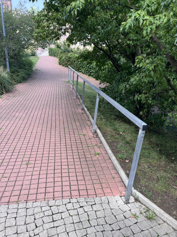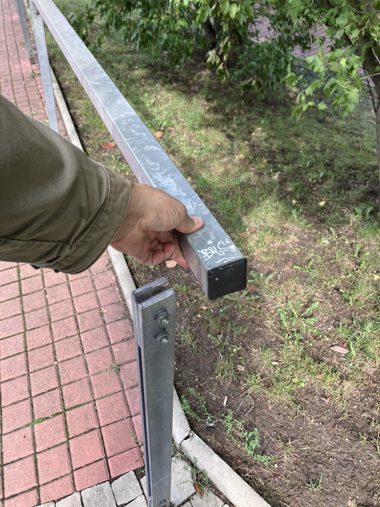 Odlomeny zabradlie v parku na Lupacovej. Neni to viditelne pokial sa človek o zabradlie neoprie.