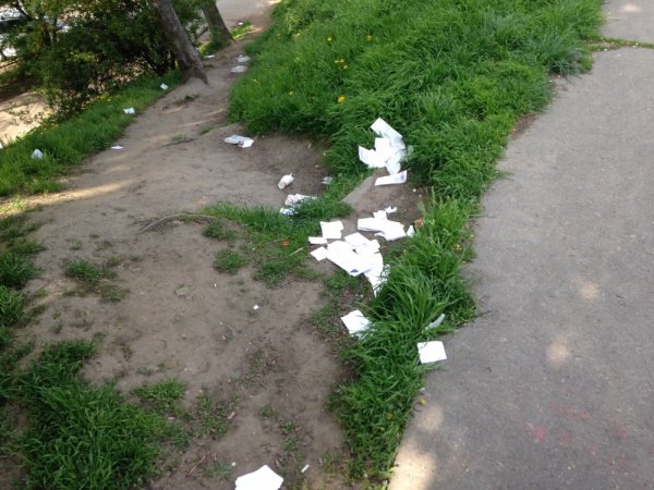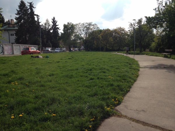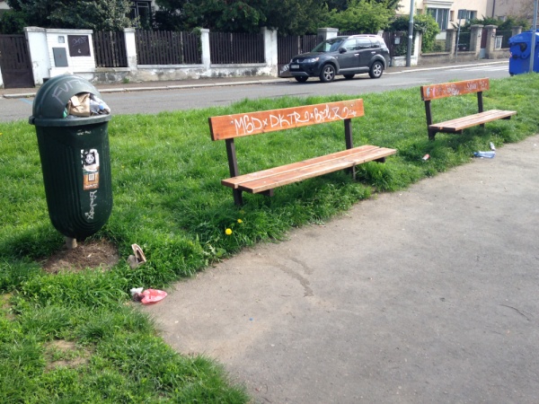 U ulice Na Parukářce (parčík u Cukrárny Smis) v parku je spousta nepořádku v trávě.