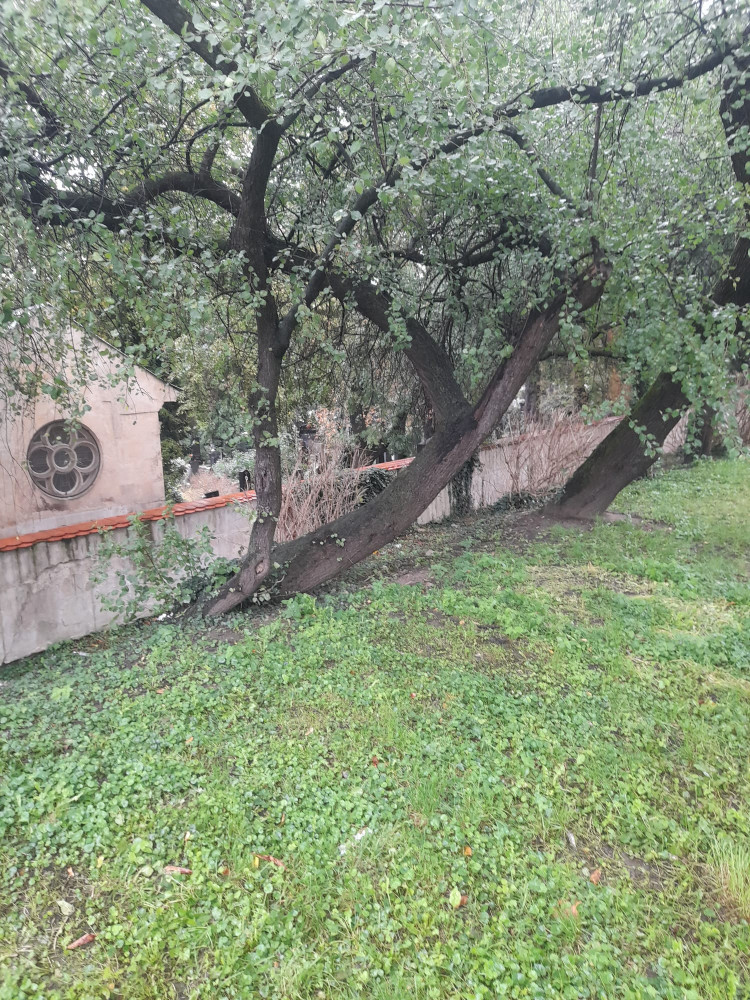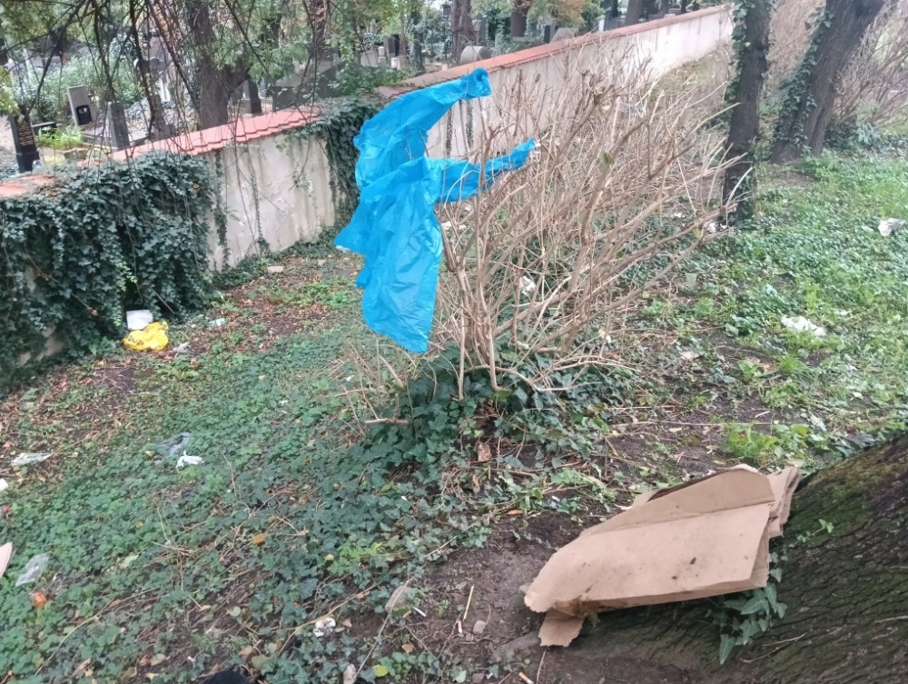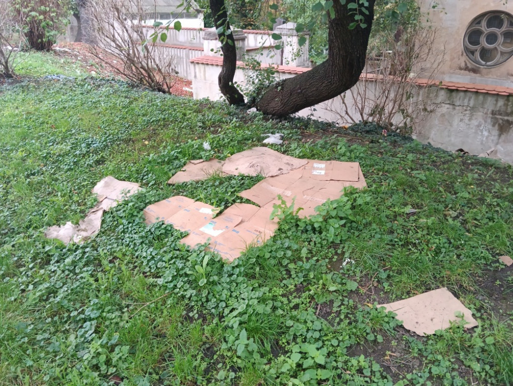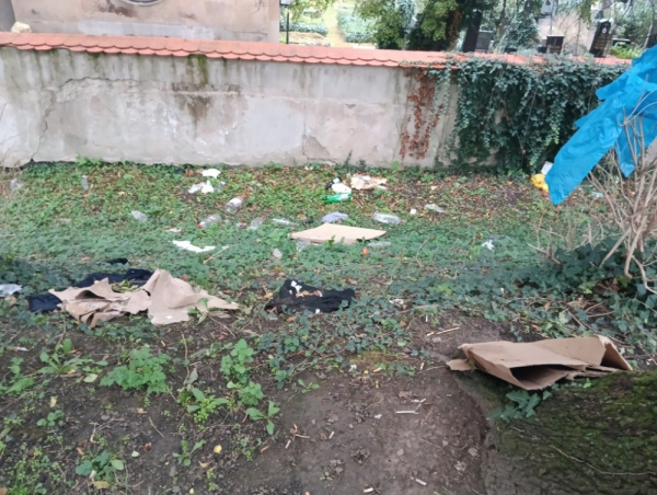 U hřbitovní zdi a na trávě papírové krabice, igelity atd. po bezdomovcich