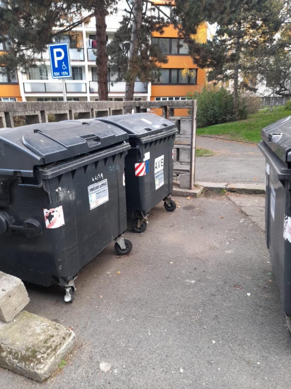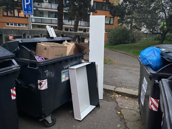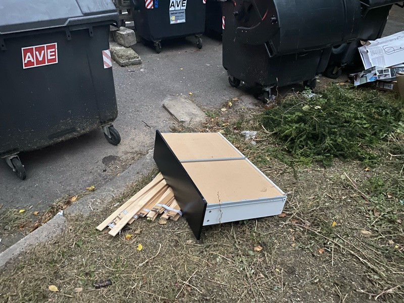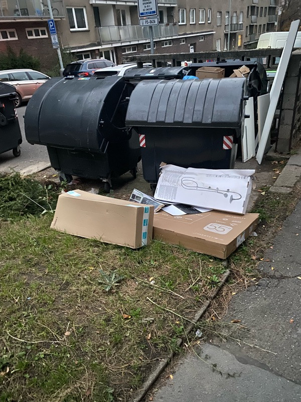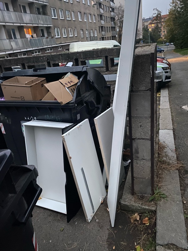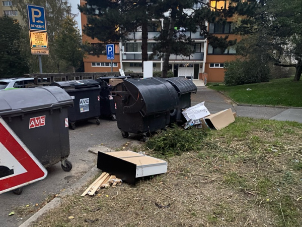 Hlášeno od občana. Rozebrané kusy nábytku a krabice u popelnic.