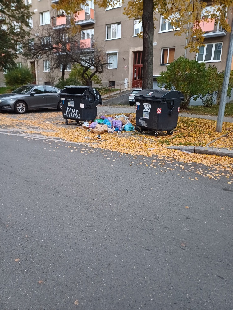 Dobrý den, za pořádek okolo popelnice je odpovědný vlastník nádoby. V případě popelnic na směsný odpad ( černé nádoby ) to bývá zpravidla majitel přilehlého domu, jehož adresa je vylepena na popelnici. -V podobných případech se obracejte přímo na něho, případně na hygienickou stanici, nebo na policii... Děkujeme za pochopení Marek Čistá Trojka