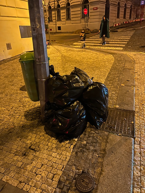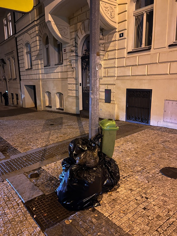 Od minulého týdne pytle přibývají a přibývají. Myslím, že základ je od pouličních zametačů.