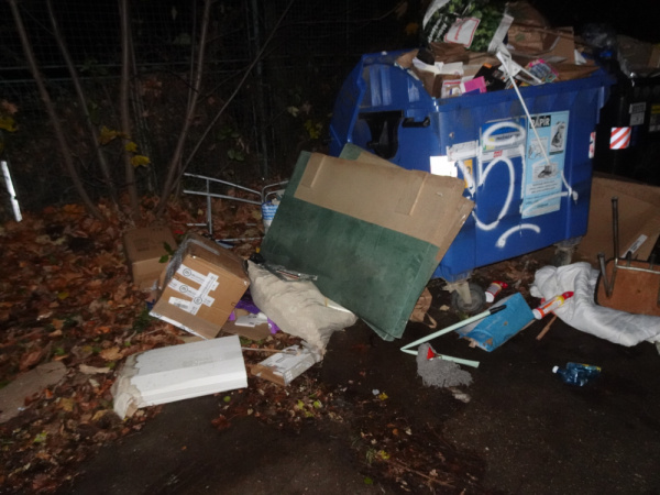 v ulici na Trebesine u tenisovych kurtu je okolo kontejneru na trideny odpad neporadek.