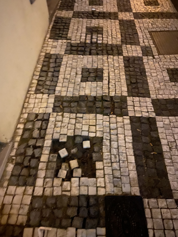 Rozbity chodnik - kostky pohazeny po okoli