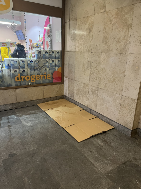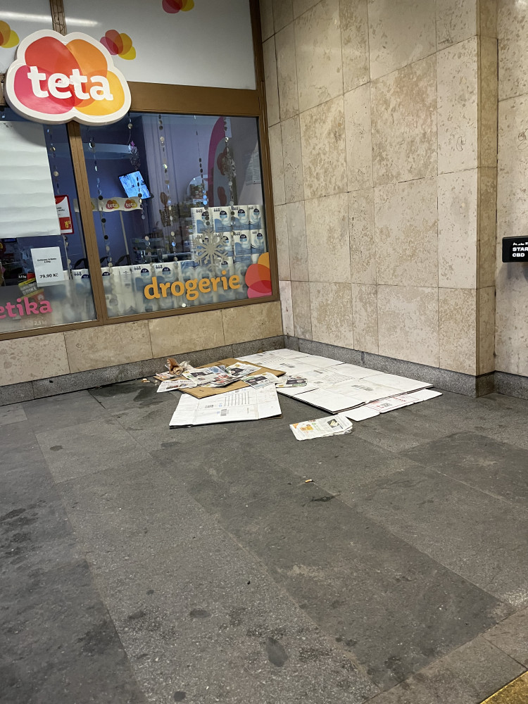 Opět kartony v průchodu do metra vedle tety