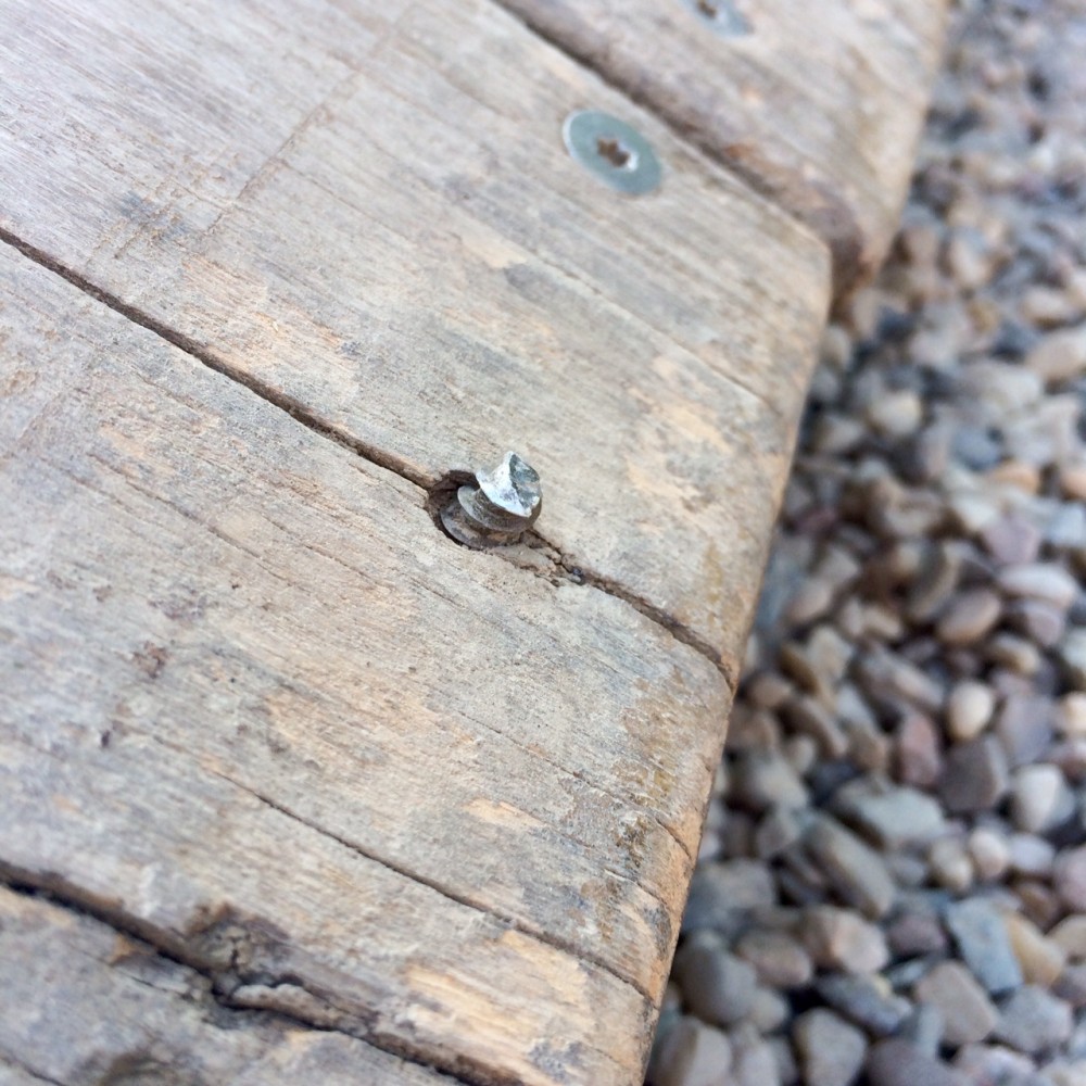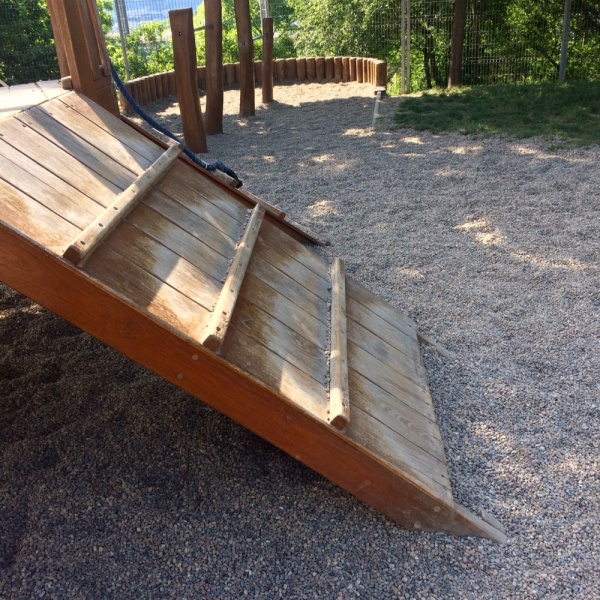 Hřiště na kopci Sv. Kříže: u stupínků k lanovce je stržená spodní lišta a ze dřeva v tom místě trčí ostré pahýly ulomených šroubů. (viz foto).