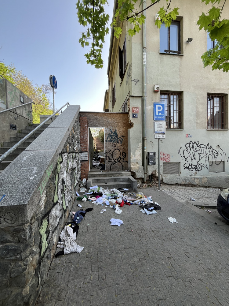 Uklidili jsme odpadky z chodníku. Pořádek můžeme zajistit pouze na pozemcích ve správě MČ Praha 3. Nepořádek za "dveřmi" je na soukromém pozemku. Požádáme kolegy z oddělení správy komunálních služeb o zvážení možností řešení v tomto případě, kdy jde o opakovaný problém.