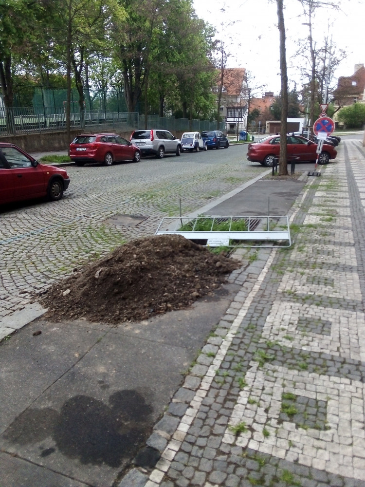 Dobrý den. Od 9. dubna je vykopána jáma pro vysazení nového stromu. Po cca 3 letech od poražení původního. Přiložené fotografie jsou pořízeny 19.4.2025. Jámu naštěstí někdo pozorný zakryl provizorně položením zábrany, jinak by do ní mohl klidně někdo spadnout. Netušili jsme, že vysazení nového stromu může trvat tak dlouho.