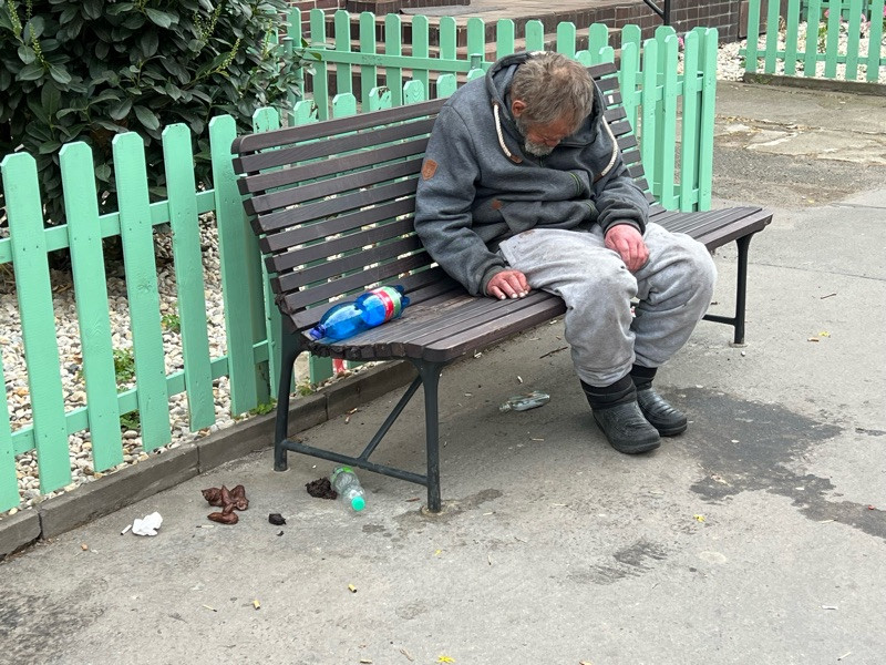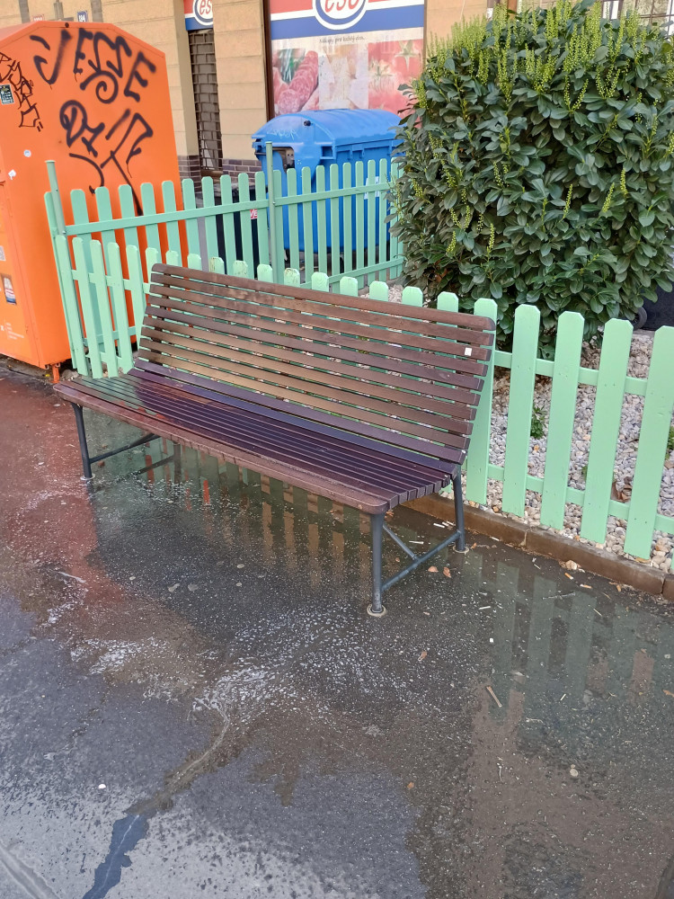 Prosim odklidit exkrementy a vycistit chodnik a pokalenou lavicku