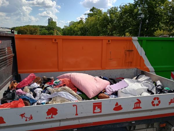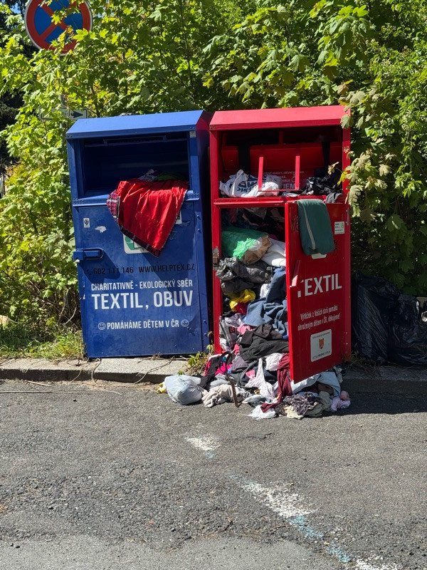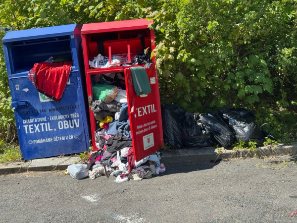 Poničené kontejnery na sběr oblečení. Firma kontaktovala v pondělí tento týden a bez reakce.