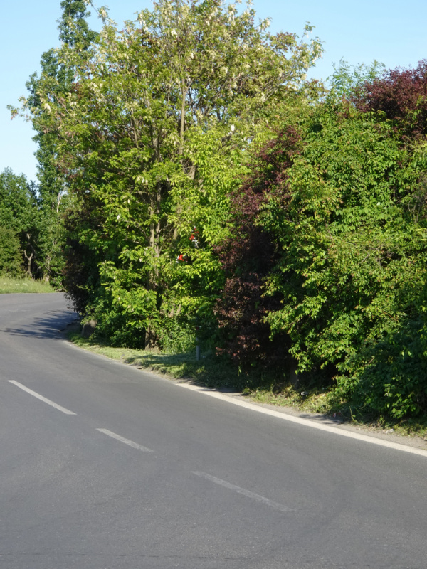 pozor dvojita zatacka. Znacka je naprosto zarostla zeleni tak, ze ji jedouci ridic nevidi.