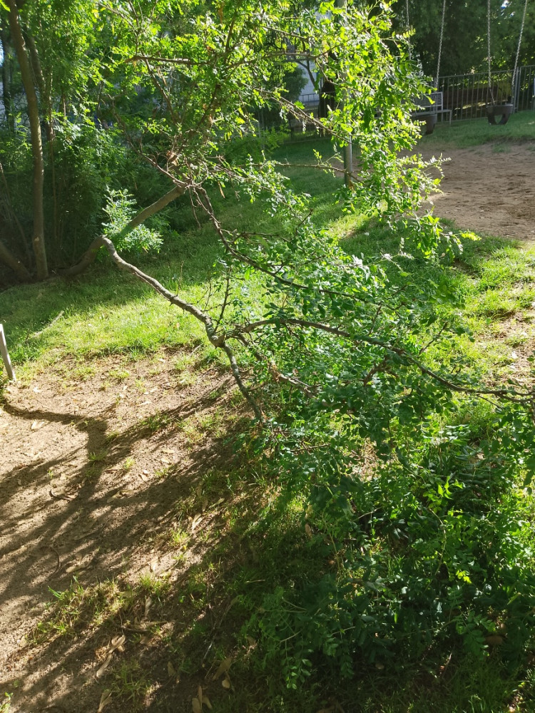 Vyvrácená část stromu na dětském hřišti ulice v Jezerach