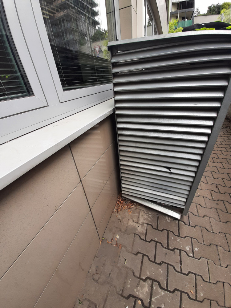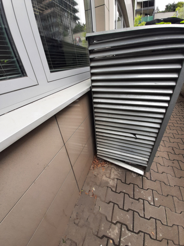 Za bodovou polikliniky pod okny úřadu MČ u klece (klimatizace) nepořádek od bezdomovců, tašky s odpadem, hadry.