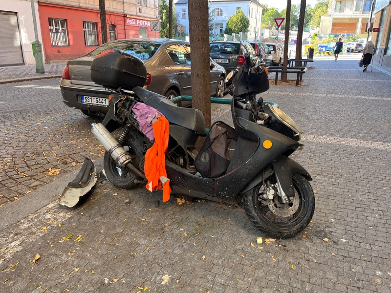 tento moto-vrak evidujeme. Bohužel právní situace je komplikovaná. V rámci správního řízení k odstranění tohoto vraku bylo zjištěny nesrovnalosti v evidenci majitele, resp. provozovatele toho motocyklu a nebylo tedy zřejmé, komu má být výzva k odstranění doručena. Záležitost řešil i soud. Vzhledem k tomu, že se řízení může dále protahovat, hledáme jinou legální cestu, jak situaci vyřešit, aby vrak zmizel z ulice co nejdříve.