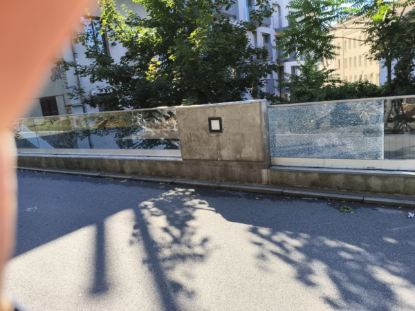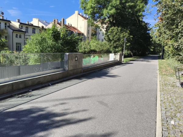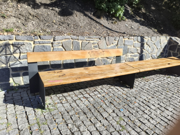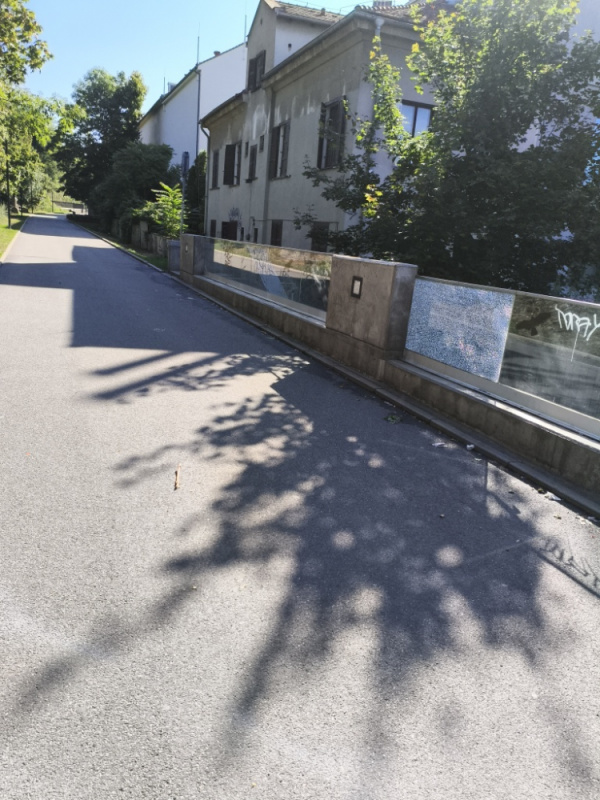 rozbitá skla a spoustu grafit v okolí Inline stezky také na lavičce
