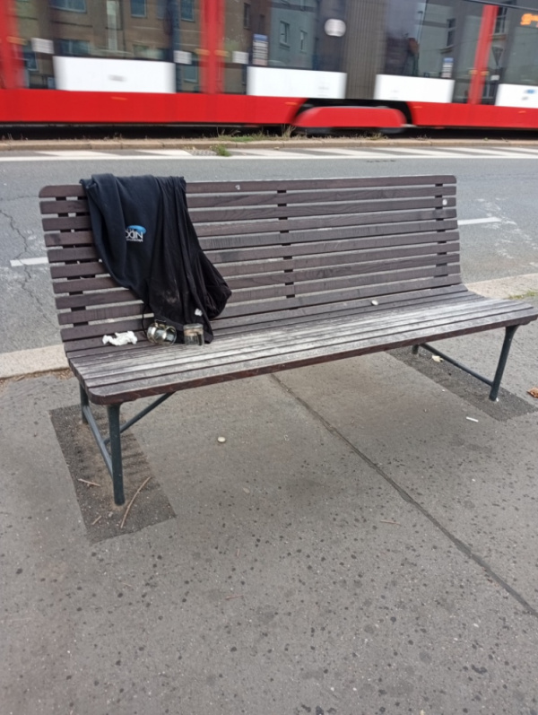 Nepořádek na lavičce naproti poliklinice Jarov