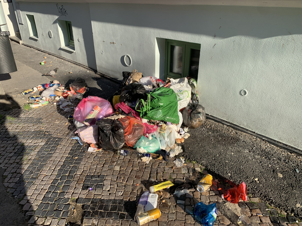 Chodník před domem Bořivojova 63, Praha 3 je znečištěn odpadky.