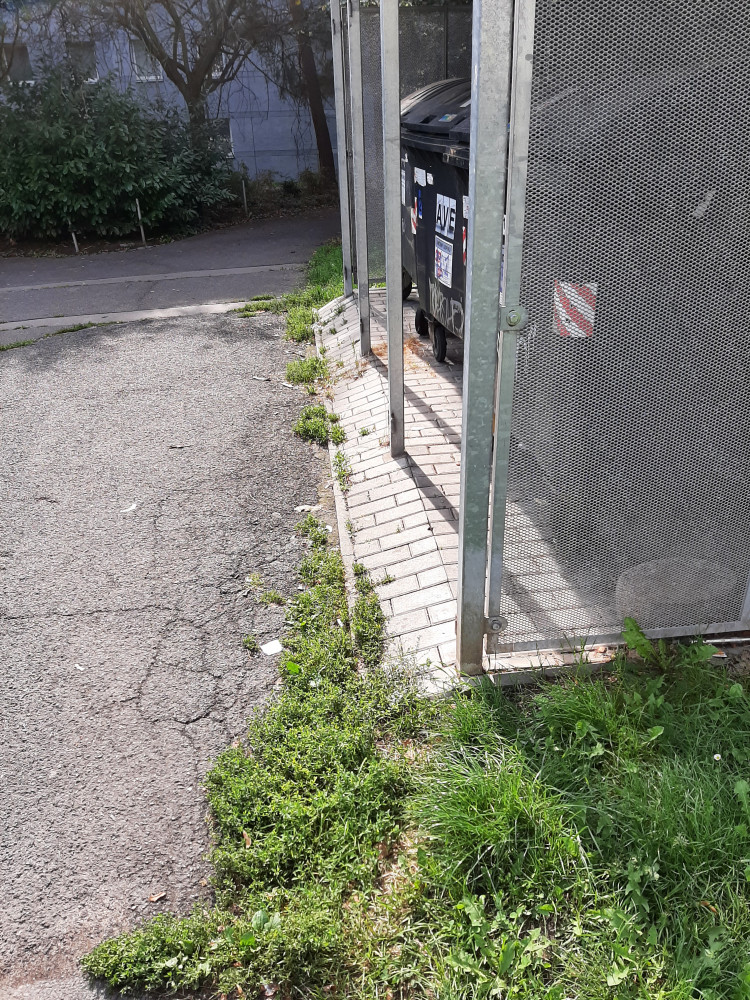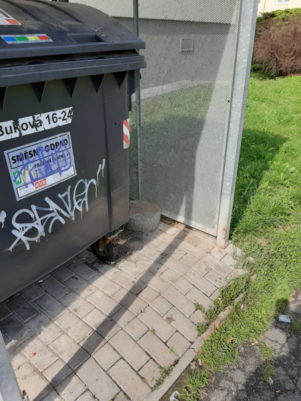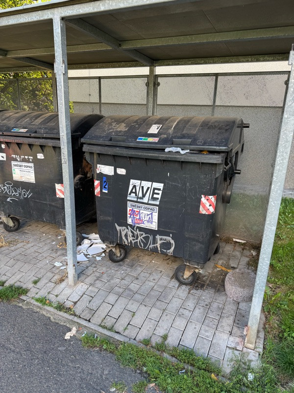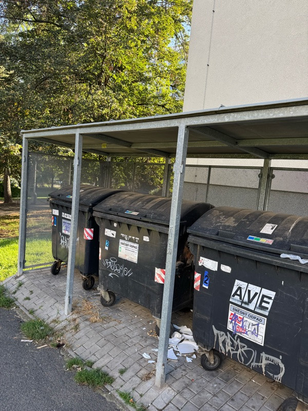 Prosime o uklid popelnicoveho stani (popelnice a mobiliar). Pokud je mozne vyuzit vapku na oplach popelnic a popelnicoveho pristresku. Predem dekuji
