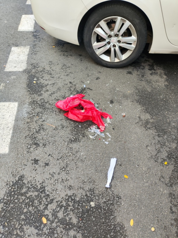 rozbitá flaška od nějakého alkoholu na zemi. je to před domem Hradecká 20 mezi dvěma autama