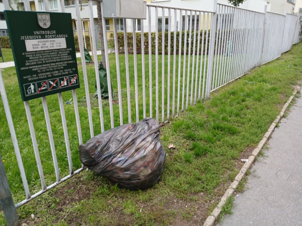 VB Jeseniova x Rokycanova pytel s nepořadkem před vchodem