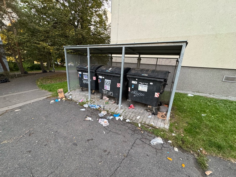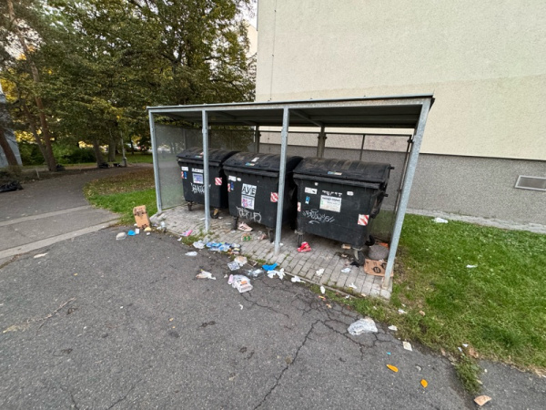 Dobry den, prosim o uklid okolo popelnic. Opet se nam nekdo prohrabal v popelnicich. Dekuji