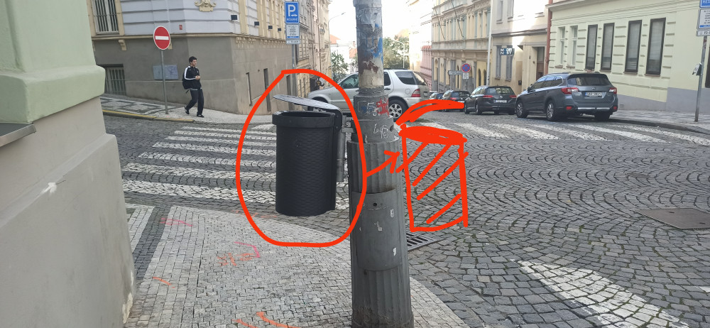 chtěla bych se zeptat, jestli by koš u přechodu na rohu ulic Cimburkova x Štítného, nešel nasadit na druhou stranu lampy viz foto. Hrozně takhle ubírá prostor a dva lidi se tam komfortně vedle sebe nevejdou.