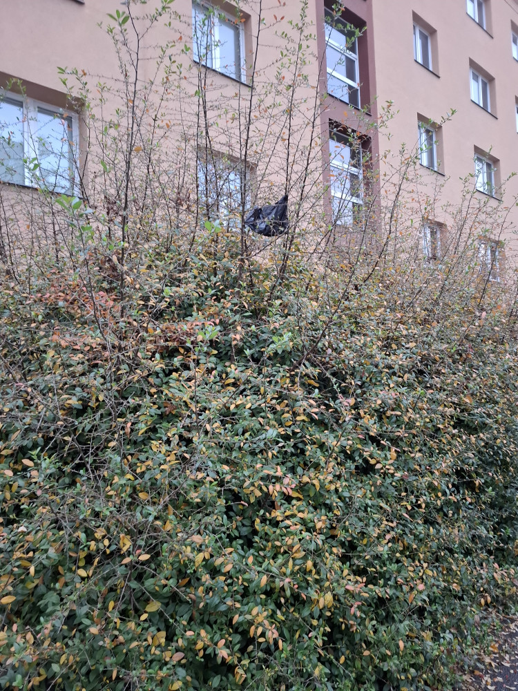 Prosím o prostříhání křoví, je trnité a nebezpečné, kolemjdoucí si z něj dělají i odpadkový koš. Díky
