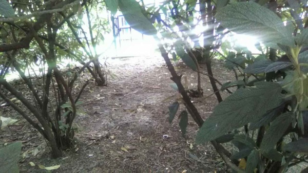 V křoví u plotu hřiště jsou na trávě papírové kartony