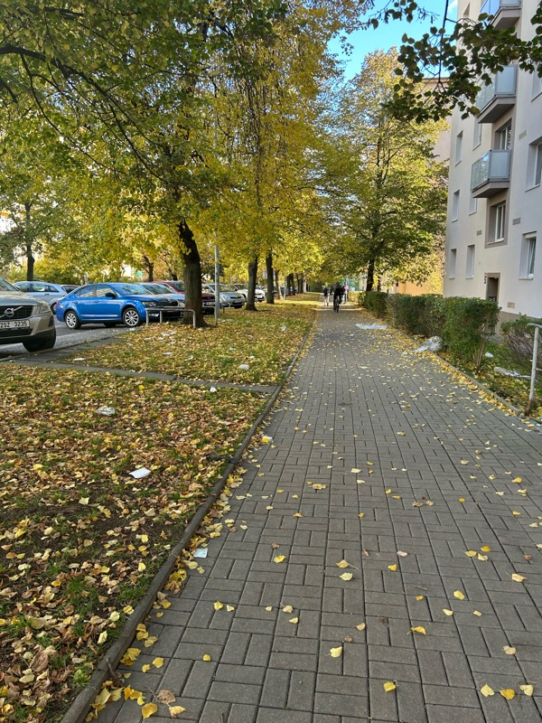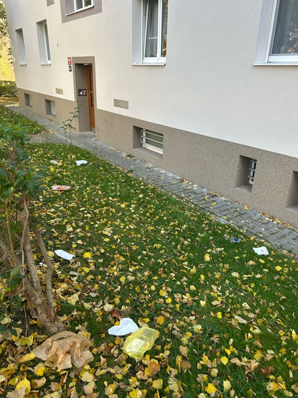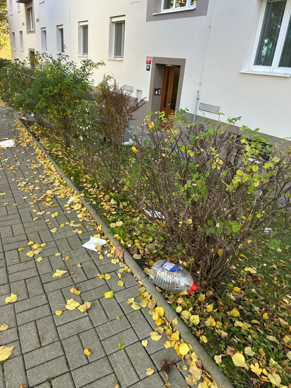 děkujeme za Váš podnět. Nepořádek poklidíme hned jak to bude možné. Úklid listí a drobného nepořádku zajišťuje pravidelná úklidová služba. Budeme je informovat.