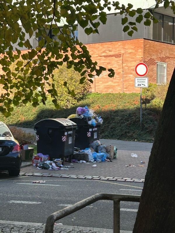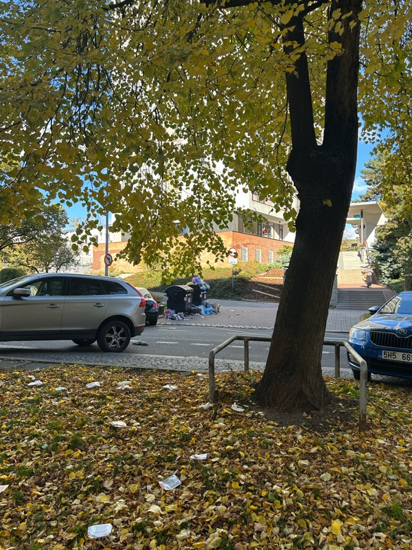 Opakovaný problém okolo těchto popelnic. Kvůli větru odpadky lítají i dále po ulici.