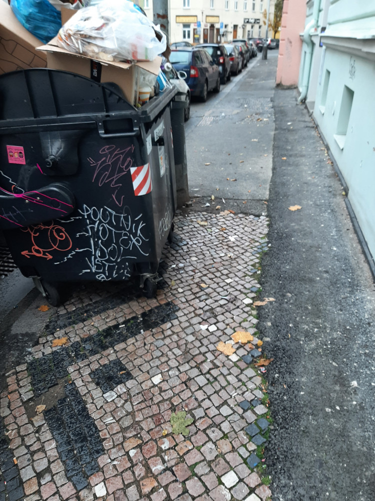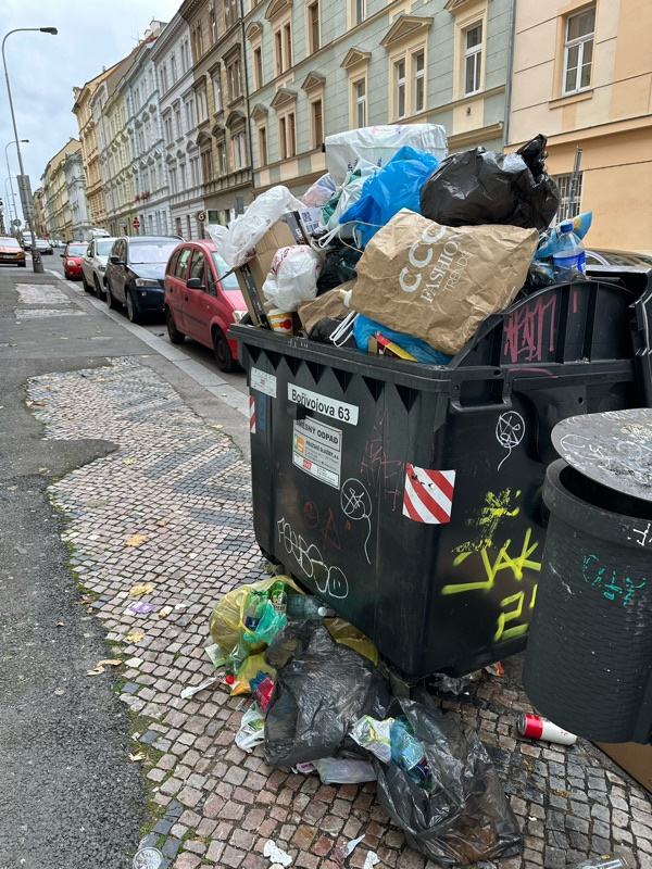 Bořivojova 63-kontejner stále umístěn na chodníku.Odpadky rozhazuje vítr.