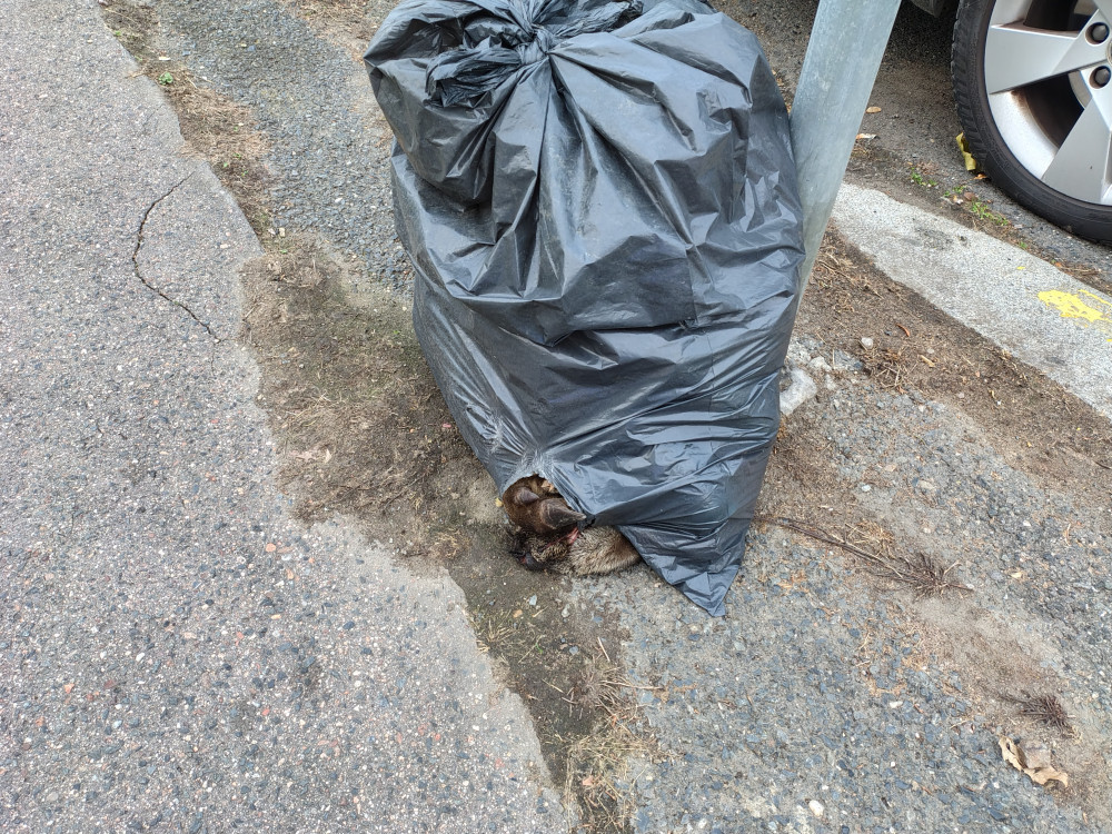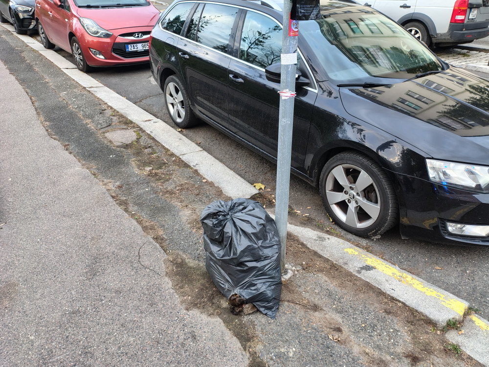 Pytel s odpadky a zbytky divoké zvěře. Prosím o úklid pytle s odpadky a kůží a nohou nejspíše z divočáka, děsí to lidi. Pytel se nachází v křižovatce ulic Za žižkovskou vozovnou x Hartigova, směrem k bazénu Pražačka u dopravní značky dej přednost v jízdě