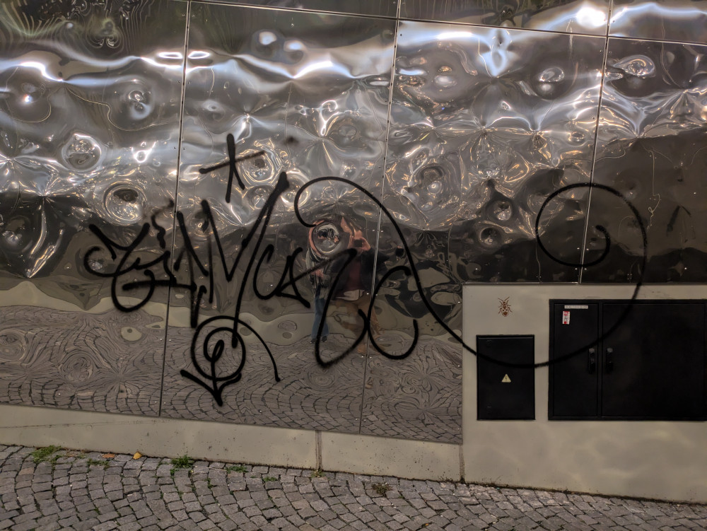 Posprejovane umelece dilo v usti Karlinskeho tunelu, na obou stranach.