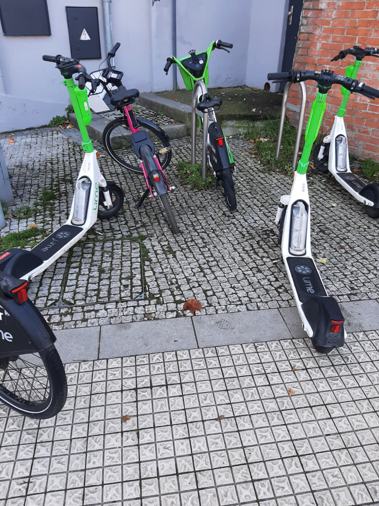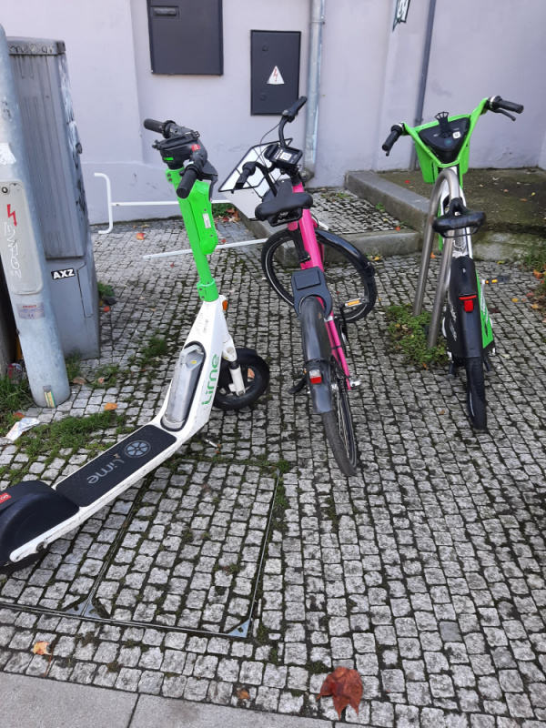 Před divadlem Ponec u stání koloběžek krabice, větší nepořádek v okolí.