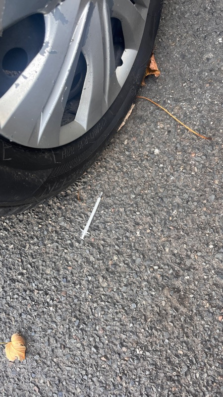 Odhozená stříkačka u kola auta před domem Loudova 6.