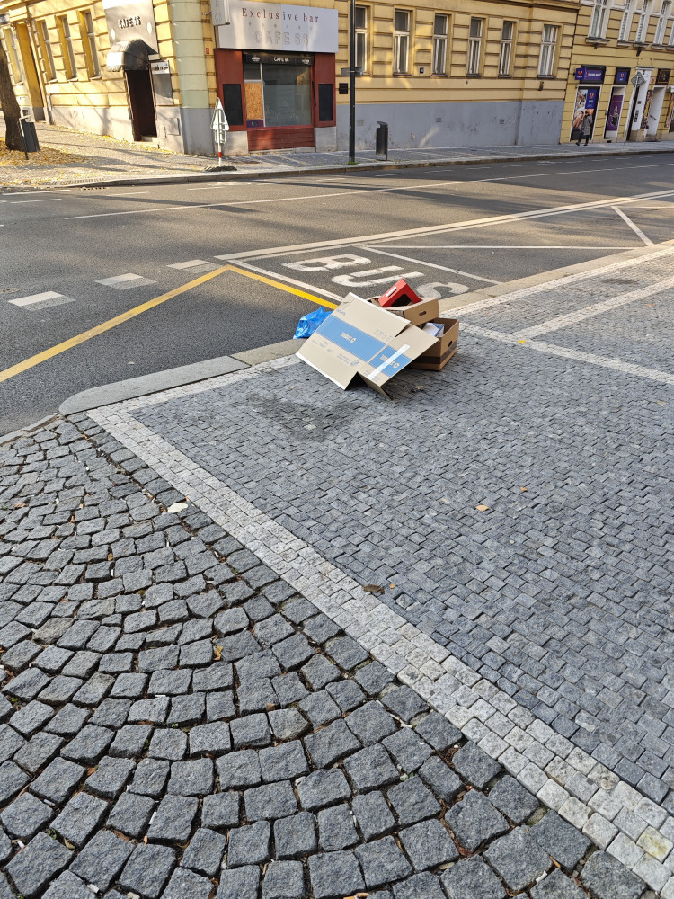 Na chodníku u zastávky Černínova hromada krabic . Krabice jsou z blízkého fastfoodu.
