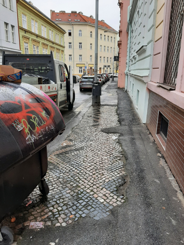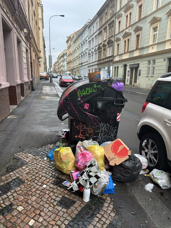Bořivojova 63- opět, kdy bude vyřešeno, že odpadky patří do kontejneru? Rovněž na chodníku stovky cigaretových špačků.
