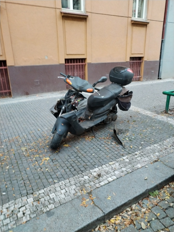 děkujeme za Váš podnět. Situace ohledně tohoto mopedu je právně složitá a probíhá správní řízení. Moped odklidit nemůžeme. Děkujeme za pochopení. Řešení jsme již urgovali.
