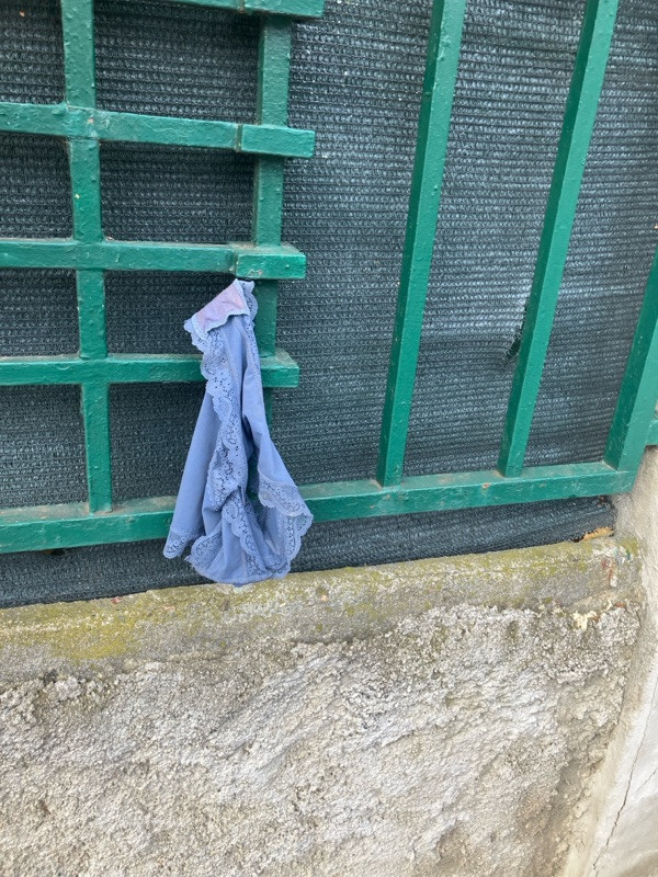 Špinavý spodní prádlo pověšení na plot - ZŠ Pražačka ulice za žižkovskou vozovnou.