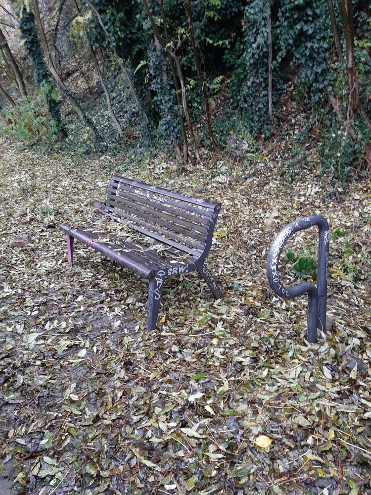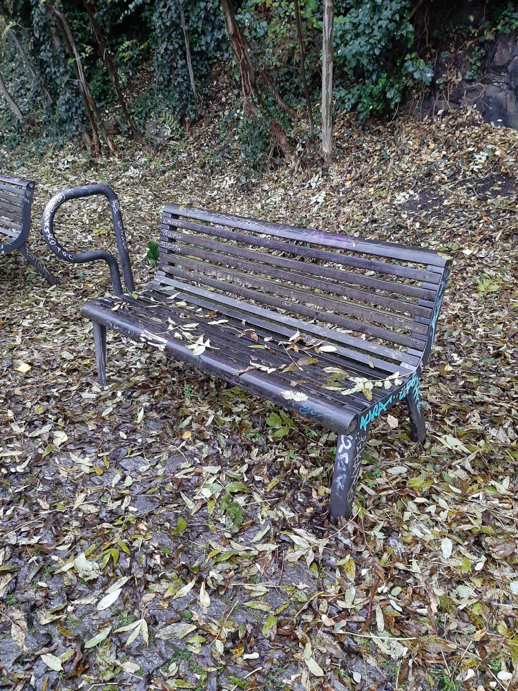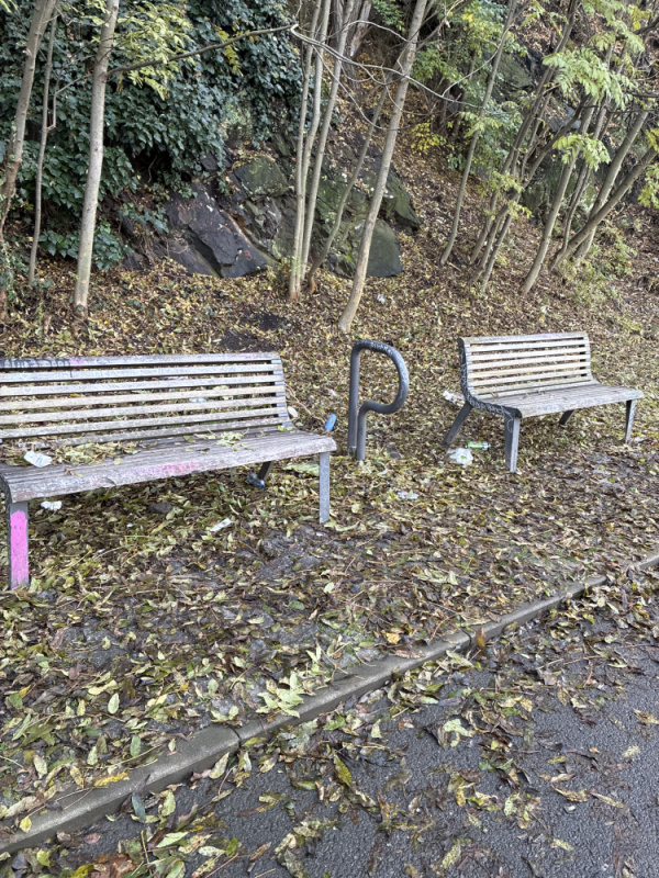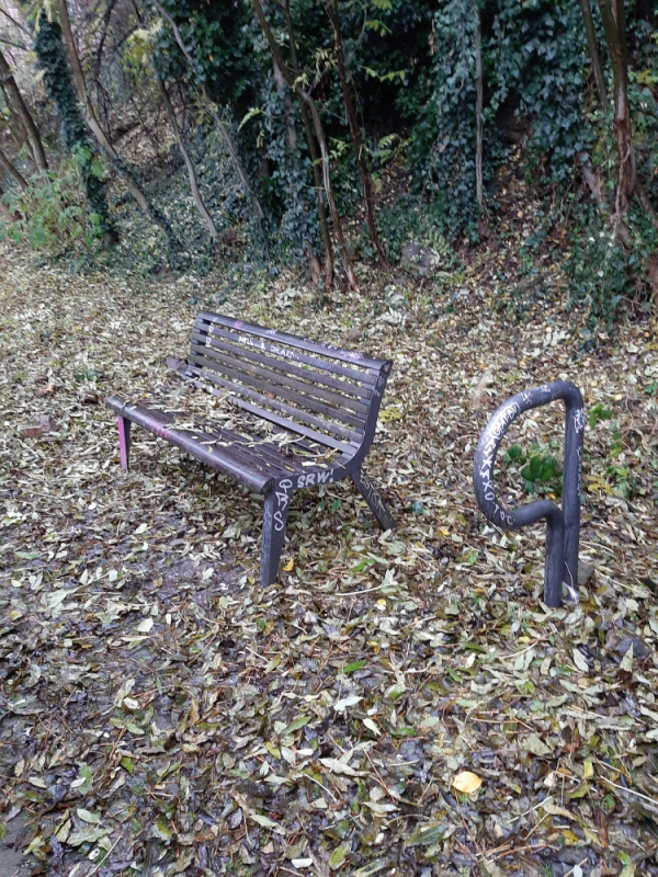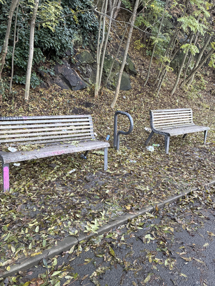 Nepořádek okolo všech laviček podél cyklostezky od vstupu ze Seiferovy po most