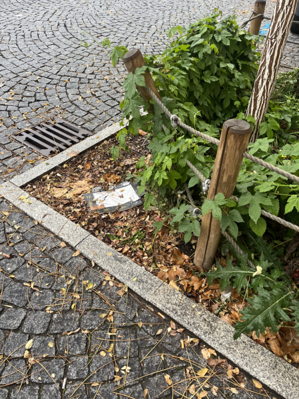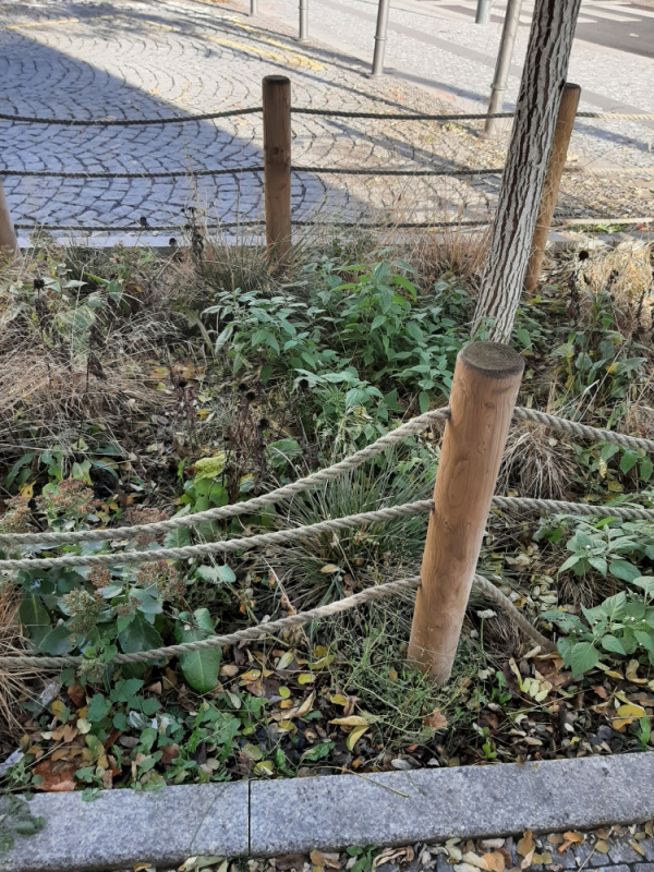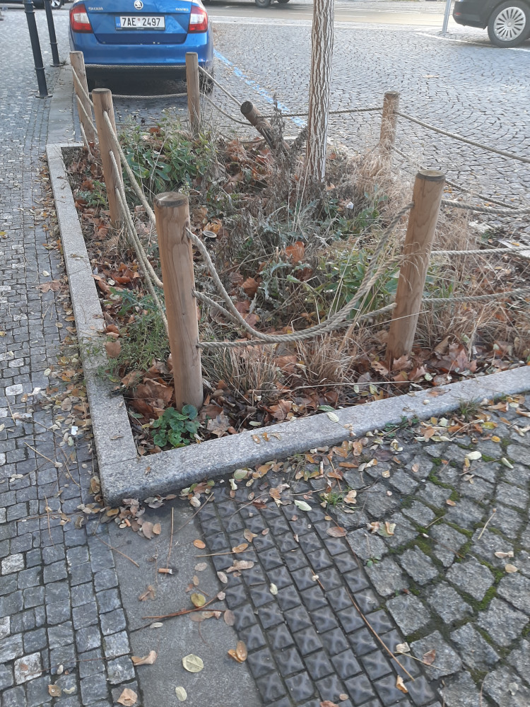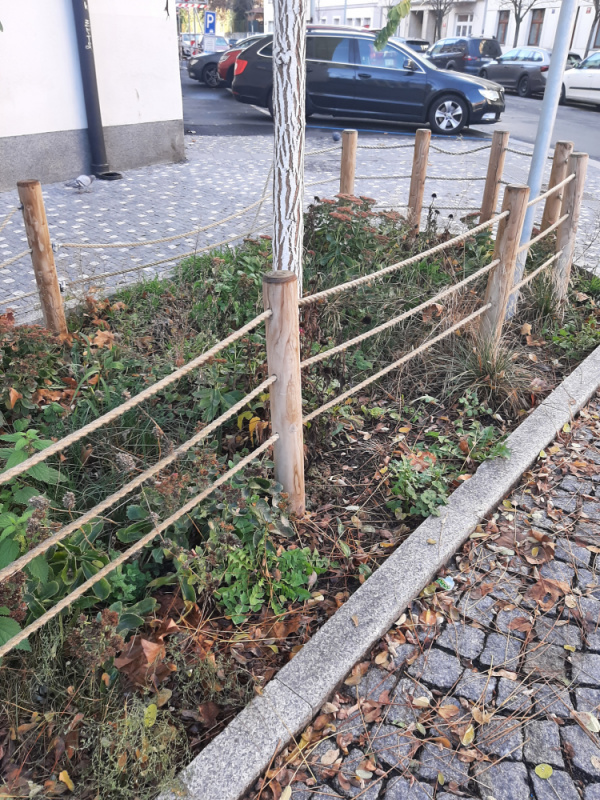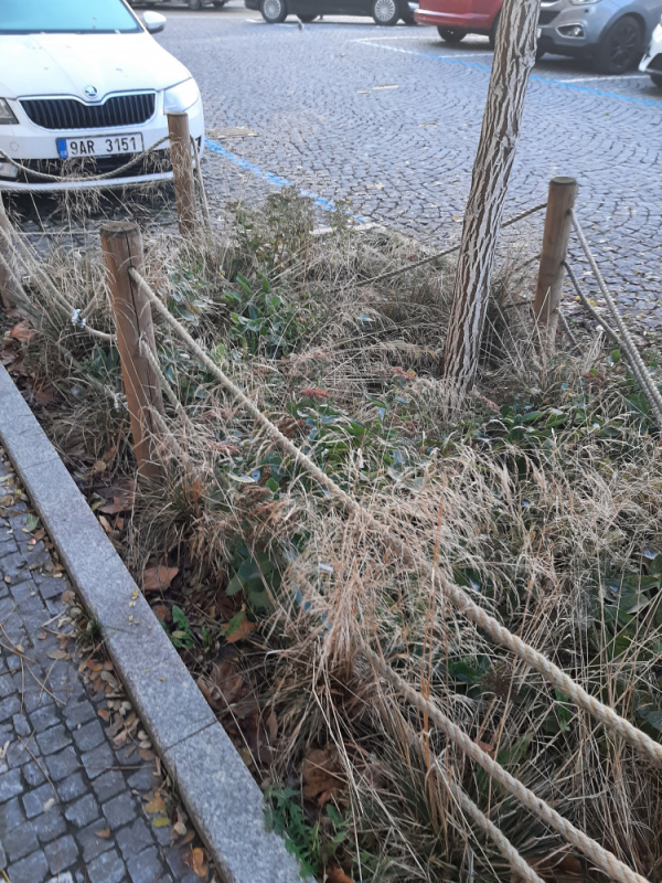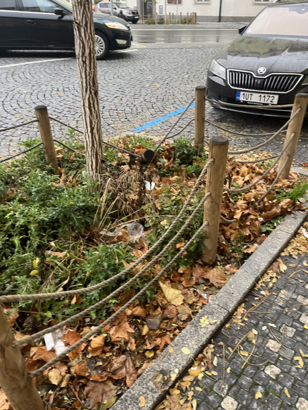 Basilejske namesti, neporadek v zeleni kolem vysazenych stromu a poskozene dreveno/ provazove plutky kolem zelene parkujicimi auty. Roh Basilesjkeho namesti a Malesicke smer k parukarce, pobliz obchodu Zabka.