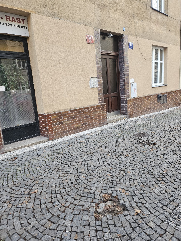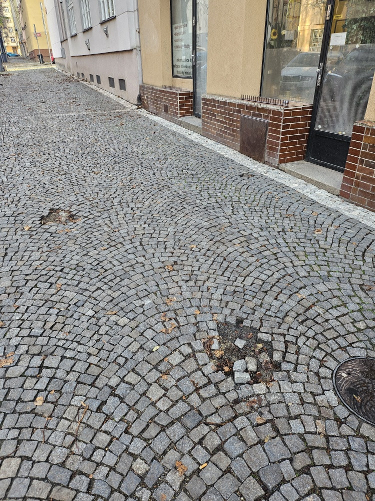 Roháčova 82 - před domem již delší dobu porušená dlažba, díry. I před vstupem do nebytového prostoru, docela nebezpečné.