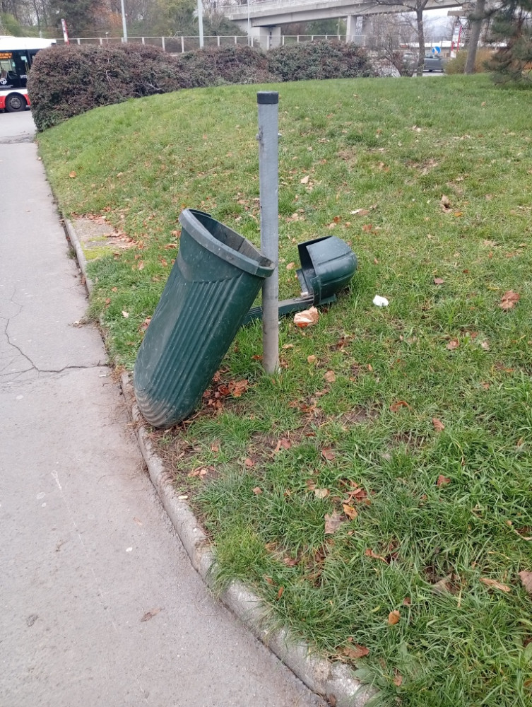děkujeme za Váš podnět. O koši víme, máme objednanou opravu.