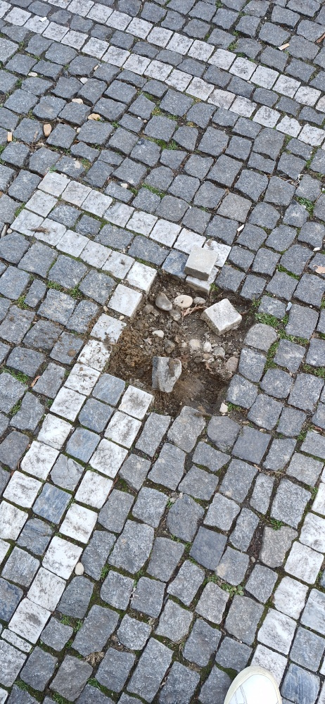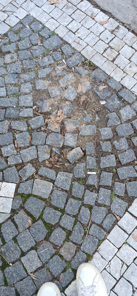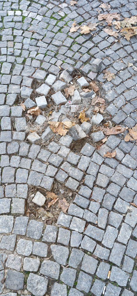 misty vykotlana dlazba na chodniku roh ulice Kubelikova a Vita Nejedleho - Kubelikova 25 a 27