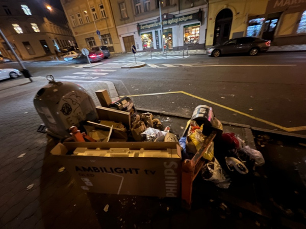 Nádoby na tříděný odpad na Prokopově náměstí přetýkají odpadem. Je to poměrně častý jev. Bylo by možná záhodno zvážit zvýšení frekvence vývozu nádob na plast a papír.