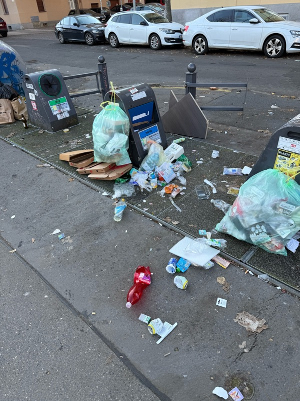 Dobrý den, děkujeme za Váš podnět. Tato plocha by měla být pravidelně uklízena pracovníky svozové služby. V rámci pravidelného úklidu by měli vše odstranit. Následně, hned jak to bude možné, provedeme kontrolu, zda se tak skutečně stalo a případně místo poklidíme. Krásný den Vaše Čistá Trojka