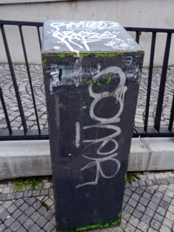 Na odpadkovém koši u opěrné zdi (u vstupu na cyklostezku) vylepené plakáty - reklama na stěhování a vyklízení.