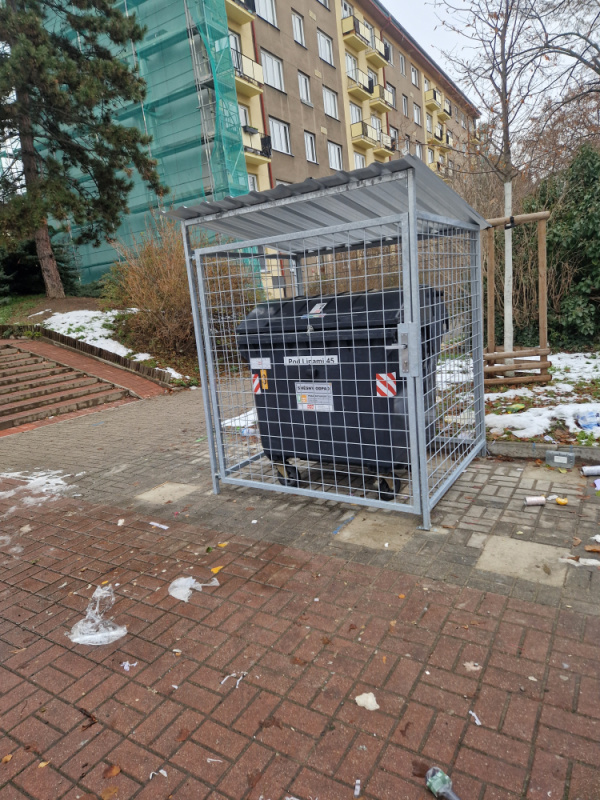 Již týden hromada odpadu, Z domů pod lipami č.45 odhrnuli odpad na postavili klec na odpad, ale obyvatelé stejně hází vše na hromadu na zem. Prosím o komlexní řešení,. Děkuji